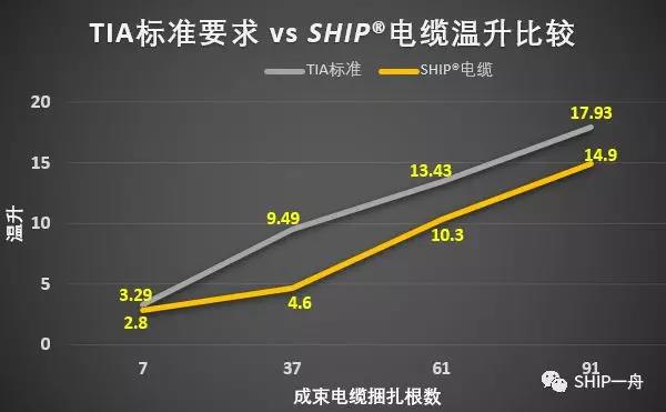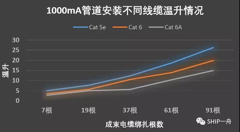 SHIP ® 品牌的电缆温升效应相较于TIA TSB 184-A:2017标准列出的数据偏小,以Cat 6A非屏蔽网线管道安装为例,SHIP ® 品牌网线温升测试数据与TIA标准数据的对比(如图4所示),从数据可以看出,SHIP?网线在绑扎91根的情况下,四线对同时供电1000mA电流,其温升低于15℃,低于标准要求的17.93℃;